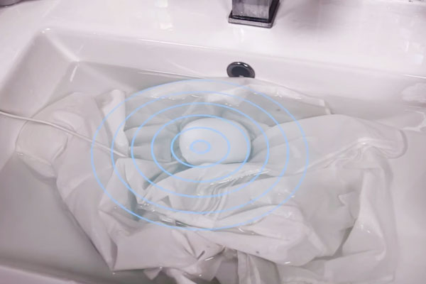 The device emits ultrasound vibrations in the water which are delicate on the fabrics and tough on dirt particles.