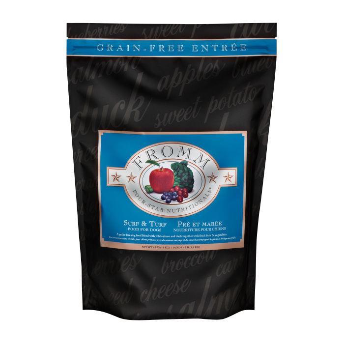Fromm Four-Star Nutritionals Surf & Turf Dog Food - Care-A-Lot Pet S Subscribe & Save 5% on your first autoship order and on all remaining orders 12.2-oz, case of 12 Quantity Description & Ingredients Out of stock. Fromm Four-Star Grain Free Surf and Turf Dry Dog Food features the delectable fusion of grain-free blend of fresh Wisconsin duck, wild salmon, chicken, hand-picked vegetables and fruit, eggs, and real Wisconsin cheese.
