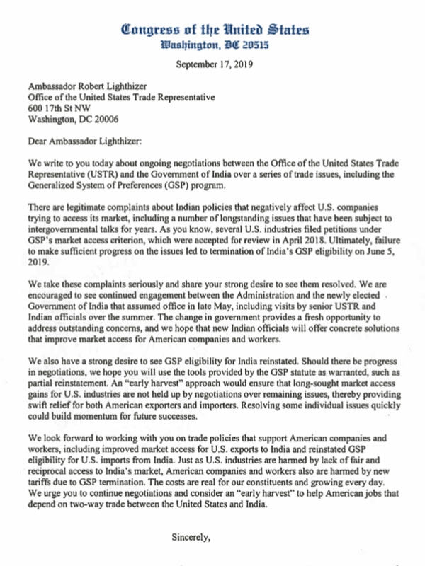 The letter shows Congress' strong, bipartisan support for swift action to reinstate GSP for India and to help constituents that depend on two-way trade, he added.